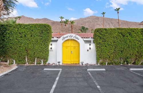 Spirit of Sofia's Poolside Adventure is the most Palm Springiest experience in all of Palm Springs! Located in Downtown Palm Springs, Spirit of Sofia is framed by the backdrop of mountains, palm trees, and midcentury modern homes. Step outside your room/cabana and right into the pool. Spirit of Sofia has it all with heated pool, hot tub, grill, outdoor dining, overflowing with poolside seating, floaties, neon signs, bright colors, rainbows, road bikes, and even a life-size chess board!