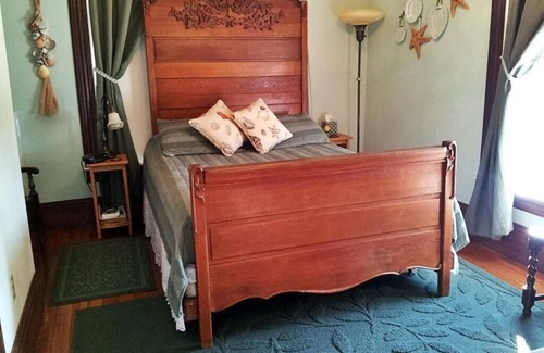 Enjoy a view of the sunset and slough from your room. It features a queen-size bed furnished with a high-back American oak bed frame. Accented with sea-green tones, a crystal chandelier, and oak floors. Includes a private bathroom and shower. This guest room is located on the second floor of our Historic House.