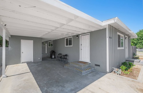 Upgraded 3bed /2 bath, all new appliances + furniture, 5min to R99, 15 min to airport, great access to Yosemite, Sequoia, Kings Canyon, quiet street close to shops/ restaurants, high speed wifi, hardwood floor, dining table and B-fast C-top, 65" TV w. DirectTV Stream + Netflicks, roofed patio + propane BBQ grill, all kitchen essentials including blender, coffee maker. 2 queen beds, full-twin bunk bed and queen sofa bed. Fenced front yard and sliding gate, roofed driveway to park 2 cars