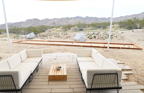 1800 sq ft new construction on 5 acres of land with unobstructed views into park, 400 foot walk to Joshua Tree park, 3 bedroom / 3 bathroom, dedicated work space also sleeps additional 2, full chef's kitchen, hot tub, outdoor shower, cowboy pool, wood fire stove, BBQ, bocce ball court, 100% off grid, 10 min to Joshua Tree village, carport. Featured Home Modernism Week 2022 & 2023 / Professionally managed by Upon Arrival Hospitality