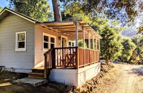 Cabin #9 is a stylishly furnished, spacious & modest stand-alone cabin which, like all our cabins, has been completely remodeled. It is nestled on a hillside closer to the forest which offers more privacy, but also beautiful partial views of the valley below through the majestic oak trees. There's loads of filtered sunlight to set the right mood and to make your stay even more memorable, we offer a wood-burning fireplace, a fully stocked kitchen, large flat screen TV, and a cozy reading nook. Along with a huge balcony, we have patio furniture for convenient lounging opportunities to commune with nature!