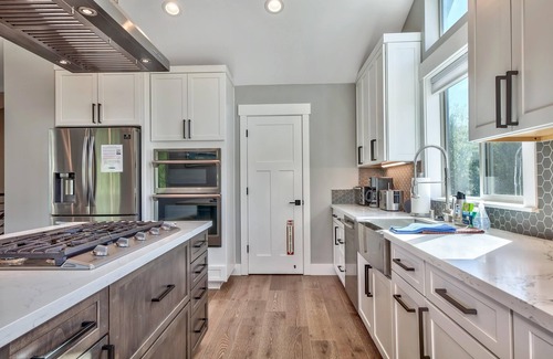 Fully stocked kitchen with gas range and built-in oven, dishwasher, refrigerator, microwave, tea kettle, drip coffee maker, rice cooker, slow cooker, and everything needed to prepare a holiday feast! A large quartz island separates it and the great room, making the space perfect for gathering and entertaining.