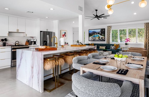 A Palm Springs private pool resort! This stunning home will delight guests with cheerful mid-mod styling, luxurious touches throughout, and a glamorous ambiance. The lively and chic living room and open kitchen/dining layout are ideal for welcoming families, couples, and groups of friends. Contemporary art and photography accent the walls, while the vaulted ceilings let in abundant natural light making for a bright and cheery setting. Choosing from plenty of inviting seating areas inside and out, guests will be kicking back in no time. E/V Charger! Beds: K,K,Q