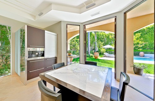 Alta Paradise is set on more than a quarter acre of gated property, but the rear courtyard is the private oasis where you’ll want to soak in the sunshine. The house opens to an airy loggia with shaded living and dining areas and a fireplace. Palm trees and a lush hedge surround the pool and hot tub, as does a terrace with plenty of loungers. Heat up the barbecue for an al-fresco dinner, or opt to entertain inside around the grand piano, sound system or indoor fireplace.