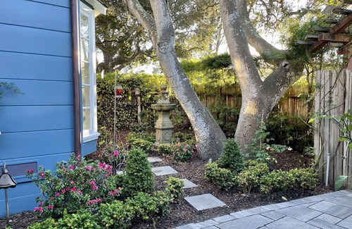 - When not eating out in one of the downtown Carmel-by-the-Sea’s 50+ renowned restaurants within walking distance, take advantage of the brand new kitchen. Fully outfitted with designer cabinets and countertops, high-end appliances, wine fridge, waffle maker, air fryer, coffee maker, new cookware, and other kitchen essentials to make you feel right at home. Take a seat at the table in the comfy chairs within the dining niche with a bay window looking out onto the front English garden with a fountain, old growth oak tree, and colorful flowers. A brand new Weber BBQ grill sits towards the front of the property, within easy access of the kitchen.
