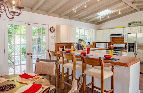 The ample and open family/kitchen/ living room with fireplace and high wood beamed ceilings embraces the tranquil atmosphere of the warm and exotic patio areas. Enjoy being lost in time. The elegant master seamlessly transitions to the verdant patio area through French doors and a swimming pool. The house also offers two other bedrooms with pool and backyard views. Both bathrooms are loaded with charm and spacious walk-in showers.