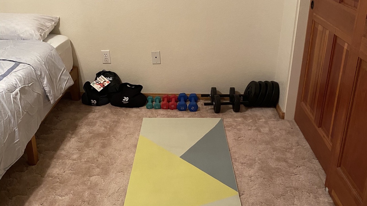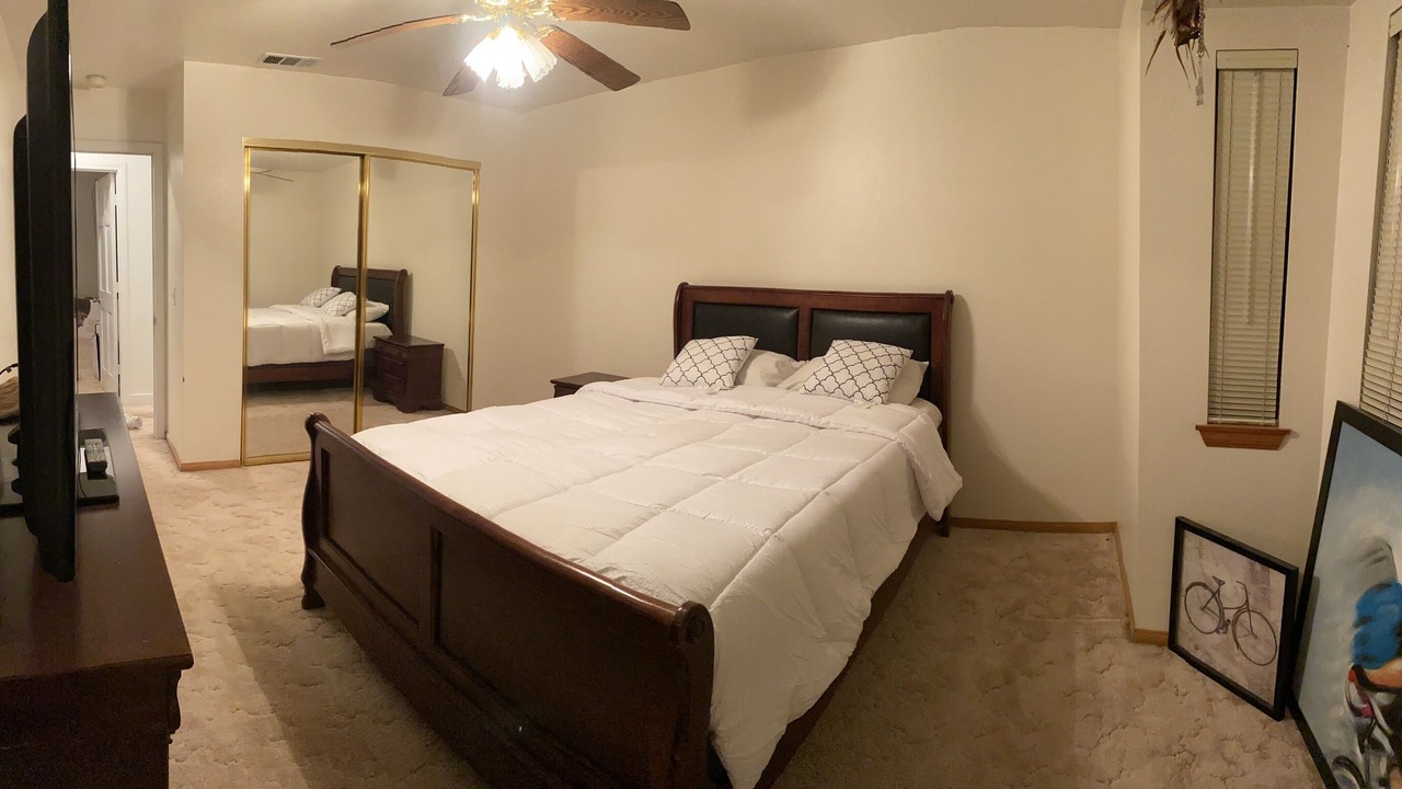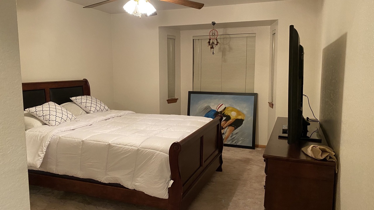 One queen bed, 50” smart tv, walk in closet, master bath with his/her sinks.