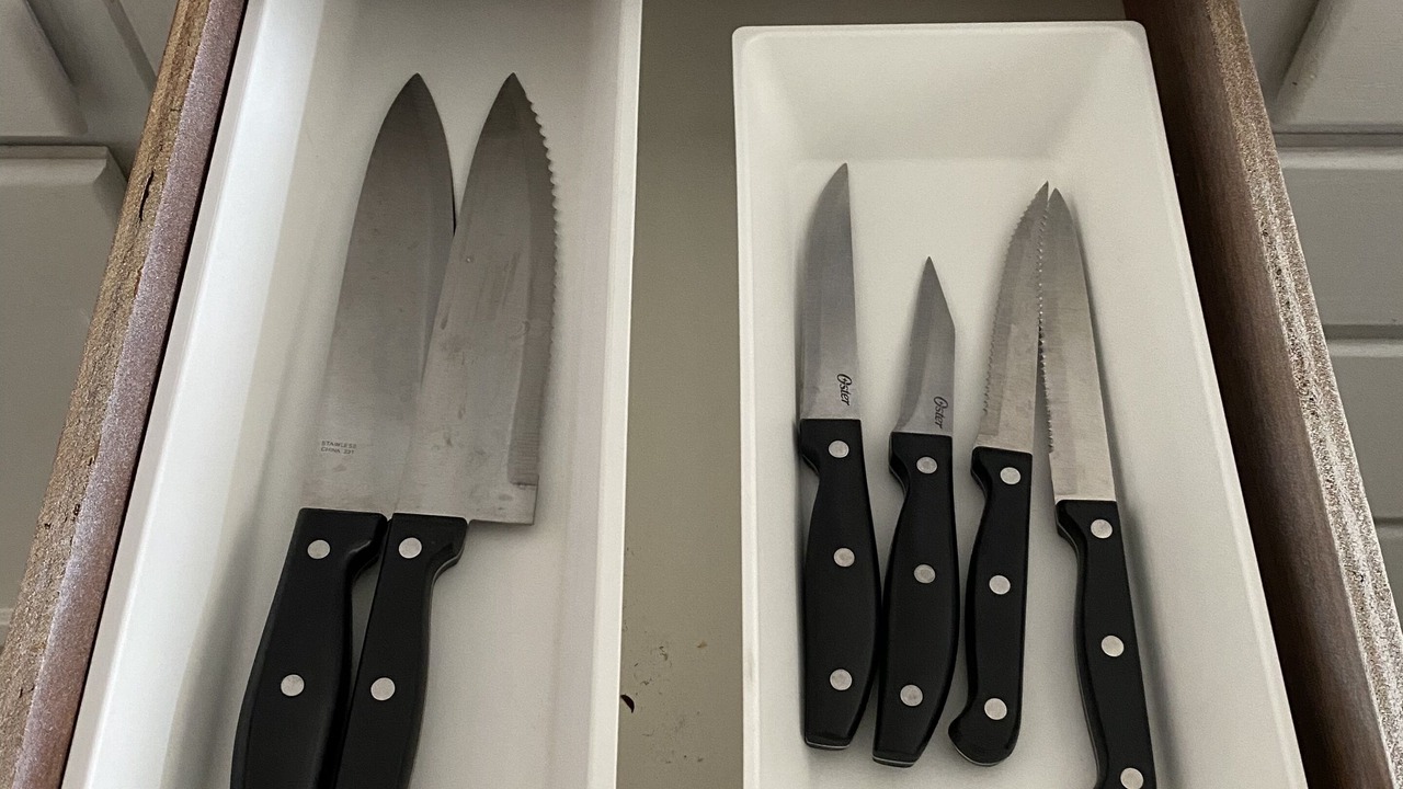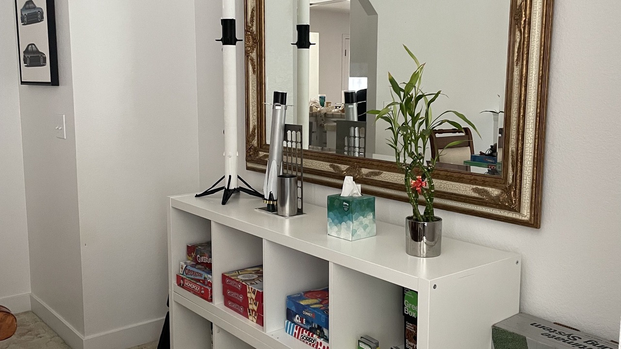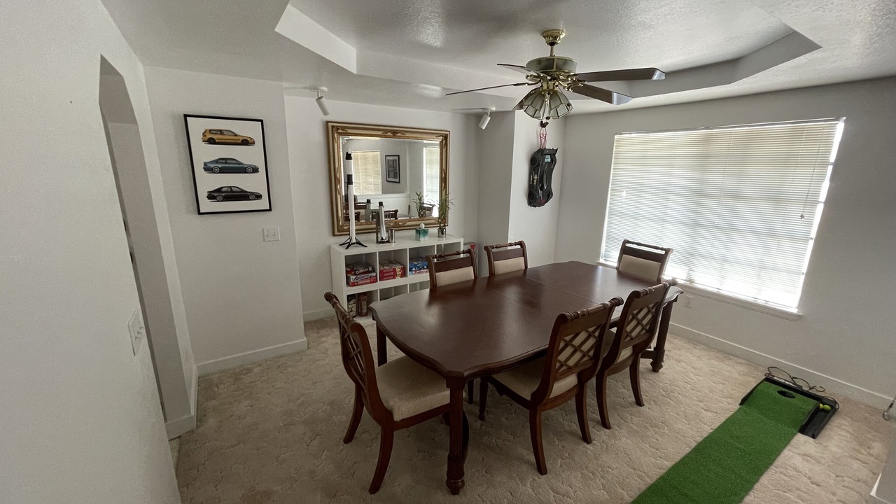 Formal dining table, full size leather couch with recliner. Axe and ninja star throwing stand up game, variety assortment of board game, golf putting area