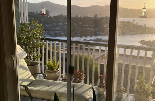 Beautiful and peaceful apartment one mile from downtown Tiburon, and less than 20 minutes by car and 30 minutes by ferry from San Francisco. The large bedroom has a queen bed and a convenient desk with Mac desktop computer and printer. Spacious living room with grand piano and large-screen TV. Both the bedroom and living room have access to a large balcony with gorgeous views of Mt. Tam, the Belvedere Lagoon and Richardson Bay--a perfect place to view dazzling sunsets.