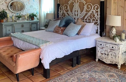 This desert barn is a vacation home designed to set the mood to nourish the heart, mind and soul. Gather for meals, meditation, or stimulating conversation. The house has a spacious master bedroom in the back with French doors that open to the patio. The main floor of the barn has one private room with a Queen bed and door that lead to the second bathroom. The second bathroom can also be accessed from the dining/living area. Upstairs is another closed off queen bedroom, and the third room has 3 dorm style twin beds with plenty of personal space between. With 2 living rooms, 4 bedrooms, 2 full bathrooms, a full kitchen made for entertaining and a children’s nook. The Bees Knees Barn has everything you could need and with 10 acres of land backed up to the mountains, there is plenty of private space for everyone to enjoy.