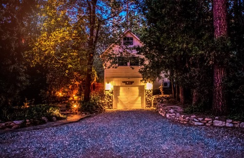 NOT FENCED - 16 foot tether • 8 guests max. 3 bdrm- all private with queen beds + bonus room “Lava Lounge” • 2 bth (tub/shower in one, shower in other) • fire pit • in town center yet very private• a very homey - home away from home family get away beautifully landscaped 1/2 acre with apple & pear trees, a small seasonal creek, walking paths and bridges