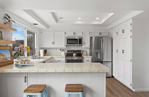 Come enjoy our newly remodeled beach home with ocean views, located on the bluffs of Solana Beach. This stylish home has everything you need for the perfect vacation and is located within a gated community that offers private access to the beach just steps from your front door! It is also walking distance to shops, restaurants, Del Mar Fair grounds, and public transportation including the train that runs up and down the coast of San Diego and all the way to LA.
