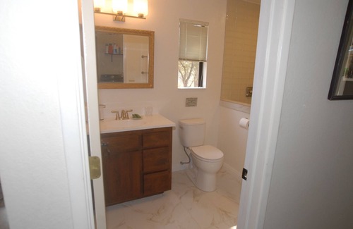 Nightly (min 2), weekly, monthly. The 750sf guest unit (detached from primary residence on 8+ acres) features an open living/dining area, completely equipped galley kitchen, 350sf California King bedroom, Twin sofabed in living room, with fine linens and bathrobes, bathroom with new tile shower, full sized washer/dryer, and woodland view/rose garden patio with grill. The kitchen features a compact fridge/freezer, Breville smart oven, induction cooktop, waffle iron, coffee pot/thermos, coffee bean grinder, French press, teapot/kettle, toaster, microwave, salad spinner, and many other kitchen tools. A tea selection, coffee, sugar, sweetener, butter, cream, salt, pepper, some spices, and olive oil are provided. Hosts will provide additional/special amenities on request.