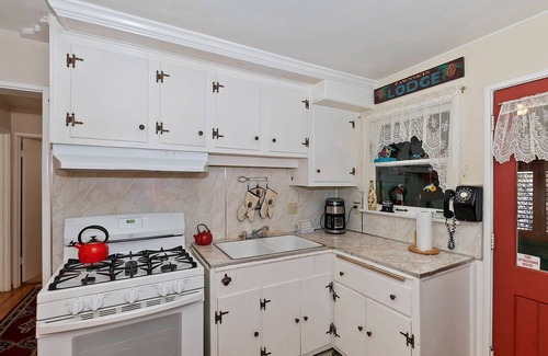 ✓ Retro Kitchen & Dining: The charming kitchen is fully equipped with a gas stove, microwave, coffee pot, and seating for four at the cozy dining table.