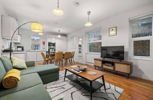 This stylish 2-bedroom, 2-bathroom apartment with an ensuite is perfect for short or long stays. Located just a 12-minute walk to Hammersmith Station, it's ideal for business travellers, couples, or families. Enjoy a fully equipped kitchen, dining for 6, and a comfy living space with a sofa bed. Close to the Thames, shops, cafés, and transport links. Fast Wi-Fi and central heating make this a great home base in London!