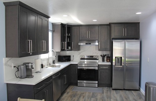 The well-appointed kitchen features sleek stainless-steel appliances and comes fully equipped with all the cooking utensils you'll need during your stay. You'll also have the convenience of an in-unit washer and dryer, making laundry a breeze.