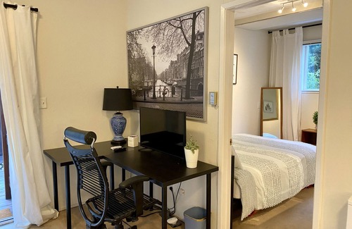 Our beautiful guest house is fully furnished to host you during your stay in the Bay Area. This free-standing unit is unique in its location in Orinda's selective and safe environment, where you can work, rest and enjoy the natural surroundings. The apartment is located close to the main house designed by NorCal modernist architect Roger Lee. It has a scenic entrance through a Japanese-style garden, and stunning views over a beautiful valley. The apartment is set close to a hill where deers roam free and wild birds fly over the valley. The location offers an unparalleled silent and secluded working/resting environment.