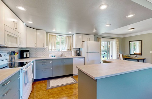 A full, newly remodeled, well-stocked kitchen and oversized island makes it easy to prepare meals for a large group. There are three bedrooms and two full baths in this single-level home: the master bedroom has a king bed, flat-screen TV, and work desk, a second has a queen, and an additional bedroom has two twin-sized beds for little guests. There's even an inflatable queen air mattress to accommodate extra travelers.