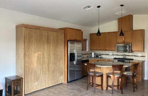 Relax with the whole family at this peaceful Casita located in Coachella Valley. Enjoy all the resort like amenities such as two pools with jacuzzis, tennis courts, pickle ball courts, fitness center, recreational room, and a 9 hole putting green. The house also has EV charging station available however the guess must provide there own charging chord and adapter.