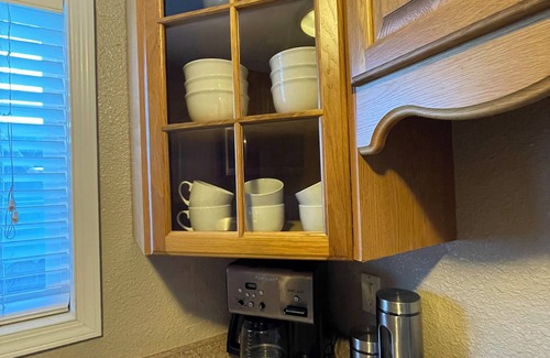The kitchen has a new microwave and coffee bar. Complimentary items include: coffee (whole bean w/electric grinder & ground ready to use), sugar & filtered water.