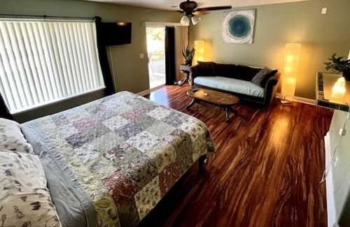 Rejuvenate and relax in tranquility and beauty in this peaceful mountain meadow retreat. This 1-bedroom studio is furnished with an equipped kitchenette, Cal-King Purple bed, Smart TV, and is located close to Bass Lake, Oakhurst, and Yosemite. A short drive from California Vipassana Center, Manzanita Lake, Fresno Dome, Lewis Creek, Globe Rock, Beasore Meadows and much more. Our 5-acre property has scenic views, and cool high-elevation breezes.