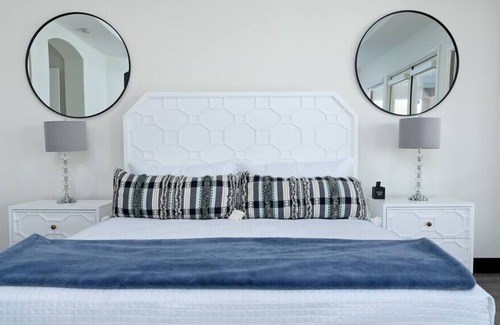 The master bedroom features an expansive walk in closet and its own deluxe ensuite with a luxurious deep jacuzzi, a large walk in shower and a double vanity stocked with all the essentials. The suite also features private access to the pool area through the large double doors.