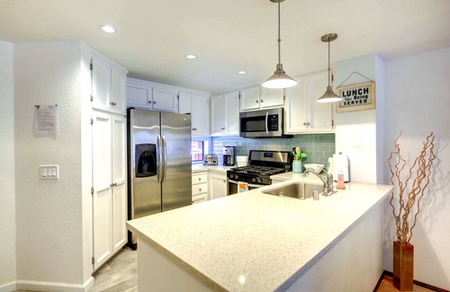 Driftwood is a gorgeous, recently remodeled 2 bedroom / 1.5 bathroom home with more than 1,200 square feet of living space, plus three balconies, a small enclosed patio and a private, secure garage. The main floor has a living room with a large flat-screen TV (including HBO & STARZ), dining room with seating for six, a completely updated kitchen and convenient powder room. The two bedrooms are located upstairs, each with brand new KING-size beds, closets, vaulted ceilings and balconies. The loft is accessible from one of the bedrooms and is furnished with two twin XL beds. The main bathroom is situated between the two bedrooms.