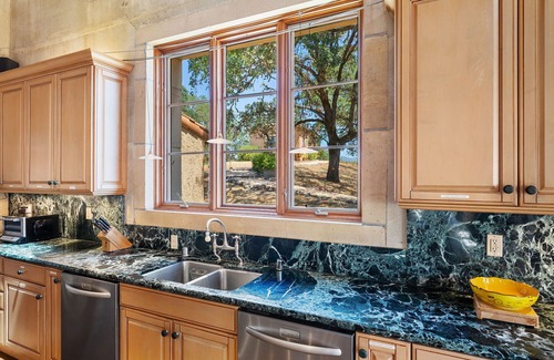 Dooley Creek Ranch offers luxury and privacy. Swim in, and relax by, the infinity pool, while taking in the panoramic views. Hike along paths to the pond, the 20 acre vineyard, to Dooley Creek, or to nearby Campovida- where you can wine-taste, play bocce, and explore their world-class gardens. The pool patio area is perfect for outdoor dining and BBQing, and, at night, gazing at the unobstructed view of the sky and stars.