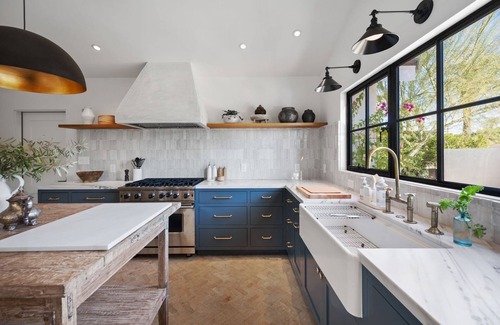 Every inch of this gorgeous property delivers a charming retreat. The finely landscaped grounds feature bougainvillea, olive and citrus trees and the scents of rosemary and jasmine. Stepping inside the exquisite interior you’ll find a vast living and dining space under a stunning cathedral ceiling. In the living space, soft couches encourage guests to curl up by the gas fireplace—there are books, games and a Smart TV above the mantle for entertainment. In the corner, a two-seat cafe table offers a cozy spot to greet the day over coffee or sip cocktails and chart stars with the nearby telescope. A dining table on the other side of the room seats up to eight guests for sit-down meals. The connected kitchen boasts Viking appliances and a large island that doubles as a breakfast bar for two.
