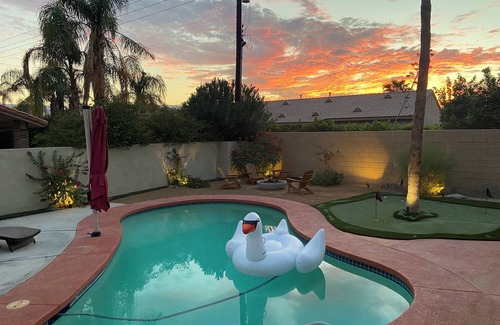 The private backyard offers a pool, built-in bbq, putting green, fire pit and great views. This desert getaway has been renovated and has a lot to offer. This home is located close to Indian Wells Tennis Gardens, Bermuda Dunes Airport, Indian Springs GC, Coachella Festivals, El Paseo shopping, world class golf, fine dining, hiking, biking and much more.