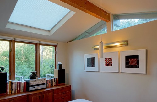The property is 1.5 acres large, the house is 750sf small but feels much more spacious. Inside the house, you'll find redwood ceilings, fir floors, skylights and dozens of wood windows (all with gorgeous views- some of the river). The house is appointed with striking mid century furniture, a luxurious queen bed and a fully equipped serious kitchen with/gas cooktop. The house is also equipped with a wood burning stove, "audiophile" stereo (easily connect wirelessly to your devices), Gigabit WiFi, TV/DVD/CD and A/C. The construction is sustainable; most of the house is comprised of vintage, salvaged, repurposed, sustainable and/or non (or less) toxic materials. The house has almost every single detail covered- you will want for almost nothing. This is a fully remodeled mid-century cottage, designed by me, for you.