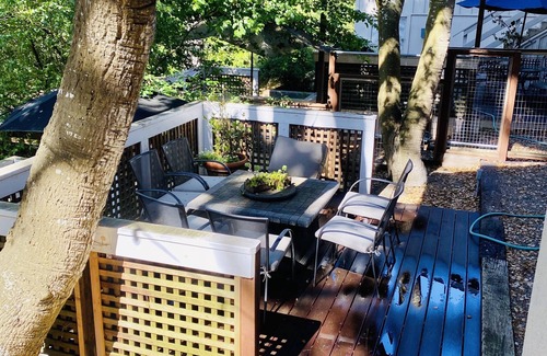 Our back yard is a tierd, partially decked hill, with a large oak tree canopy, hot tub and firetable. Our large gas bbq is also in this get a way from it all spot.