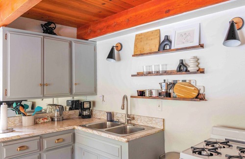 The kitchen includes cooking essentials, a coffee maker, a Bialetti for espresso, a matcha whisk, and a table with four chairs for dining. In the warmer months, you can also take meals on the back deck (seats 4) or on the front porch (seats 2).