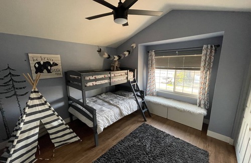 There are 4 bedrooms upstairs and 1 bedroom downstairs. There are 3 parks for children within walking distance. There are also a lot of walking trails and hiking nearby. We also have a treadmill and free weights for your use if you’d rather stay in.