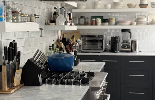 Make the most of the cooks kitchen featuring carrera marble countertops, undermount sink, gas cooktop and oven, wine cooler and Reverse Osmosis water system. It is stocked with all appliances and gadgets one needs to cook up the perfect meal including a Vitamix, Nespresso coffee maker and airfryer. The kitchen opens to the dining table in front of the large window that provides a view of lots of roses and lavender that line the fenced in front yard.
