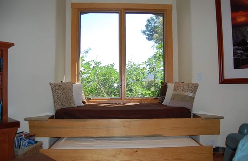 Our newly constructed Yosemite Straw Bale vacation home is a wonder. While the straw bales provide incredible R-50 insulation, we are using passive solar heating for preheating our radiant floor heating system with an instantaneous hot water heater as a backup system. Our photovoltaic grid panels are naturally creating clean energy from the sun. We tested these techniques on our own home and perfected them in this vacation rental for your enjoyment. Made to feel like your private second home, design touches include a social kitchen with a granite slab bar height counter, finished dyed concrete floors, and cozy radiant floor heating. Sitting hilltop at 3000 feet elevation (914m), the house includes a private deck perfect for relaxing and enjoying the views. We are also honored to share with you, eight fine art prints by renowned Sierra photographer Howard Weamer.