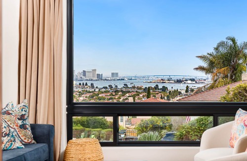 A newly remodeled San Diego home with designer furnishings and sweeping views of downtown, the harbor, and the ocean. Set on a quiet cul-de-sac, it features elegant interiors, multiple spaces to relax, and a spacious backyard with pool and spa. Minutes from beaches, Liberty Station, downtown, and the airport.