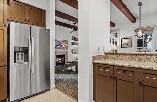 A two bedroom condo at Legacy Villas in a quiet location across the street from the main community pools, fitness center and clubhouse. The property offers a master bedroom with a king bed and a guest bedroom with a queen bed. The master bedroom has a private bathroom with a soaking tub and separate shower. The bedroom opens to a private patio. The guest bathroom is located across the hall from the guest bedroom and has a combined shower and tub. There is a stacked washer and dryer in a closet adjacent to the guest bathroom. The spacious living room features a gas fireplace, a flat screen TV, a queen sleeper sofa and a dining table with seating for six. The living room opens to a large patio including a dining table with seating for four. The full kitchen has a gas stove and oven, built-in microwave, dishwasher and refrigerator/freezer. There queen sleeper sofa in the living room provides sleeping for up to six. The property offers comfort and value in a great location. It can be combined with LV006 (Downstairs Studio Near the Clubhouse and Fitness Center) to create a 3 bedroom villa with 2 master suites (subject to availability).