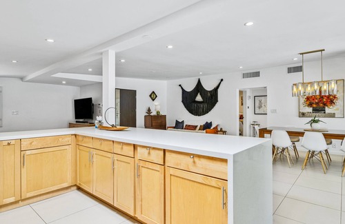 Mid-century modern home with pool, pool spa, grill, & casita with kitchenette is located in Cathedral City Cove. Mid-century modern home with pool, pool spa, grill, & casita with kitchenette provides accommodation, featuring Air Conditioner, Bedding/Linens, Kitchen, among other amenities. This House features Air Conditioner, Bedding/Linens, Kitchen, to make your stay a comfortable one.