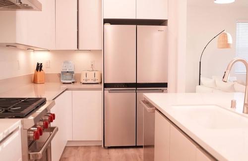 The fully equipped kitchen is a chef’s delight, featuring stainless steel appliances, quartz countertops, and all the essentials to prepare delicious meals. Gather around the dining table or enjoy al fresco dining on the private patio.