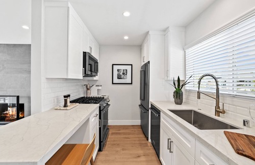This stunning, completely remodeled 2 bedroom, 1.5 bath townhome is the epitome of modern Southern California living. Completely renovated to the studs from head to toe, including new plumbing, electrical and A/C, this home features beautiful luxury vinyl wood flooring throughout, custom built cabinetry, recessed LED lighting, designer fixtures and hardware, and peek-a-boo ocean views from the upstairs bedroom.