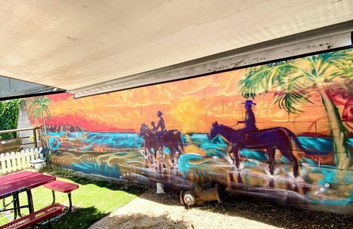 Step outside to enjoy the outdoor patio, adorned with a beautifully recently done mural, 🎨 adding a touch of artistic charm to your stay. This setup makes it ideal for small groups or families looking for a practical and budget-friendly accommodation. 🌟