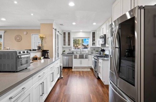 This home accommodates up to 10 guests with 4 bedrooms and 3 bathrooms. Additional spaces include a fully stocked kitchen, living room, dining room, den, laundry area, and garage. Our kitchen is stocked with an extensive list of small appliances, cookware, dinnerware and utensils needed to prepare almost any family meal. We provide a starter kit of seasonings including salt, pepper and olive oil. Please inquire with our team if you would like a complete list of all our cookware and small appliances.