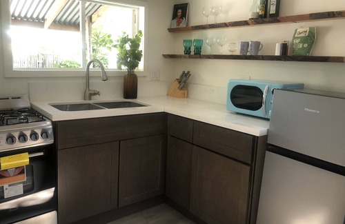 Enjoy all the amenities downtown Ojai has to offer...the cozy cabin guesthouse is just 1/2 block to the best restaurants, coffee houses, and shops in Ojai. Very strong dedicated Wi-Fi will help you get your work done while being shaded by ancient oak trees. The guesthouse is located in a very quiet enclave of homes...it is a completely separate house towards the back of the property with its own completely fenced outdoor space. The queen sized bed is in a loft area that is accessed by a ladder and from the bed you have views of the oak trees. Newly renovated in 2023, this cabin is rustic on the outside with modern amenities inside.