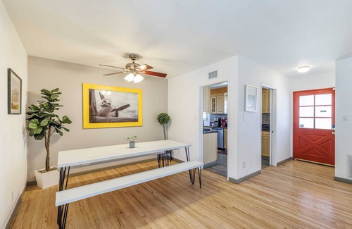 Designer styled & centrally located 4BR traditional home with pool, BBQ & firepit to enjoy outdoors! Catch sun on the lounge chairs or enjoy outdoor dining on the shaded patio while sitting under the cafe lights in the evening! Firepit with seating area for evening ambiance! BBQ & enjoy your meal under the trees with your group! Top notch beds & linens, chargers for all your devices, TVs in all rooms (Satellite in LR), blackout shades in bedrooms, stocked kitchen & coffee maker round it out :)