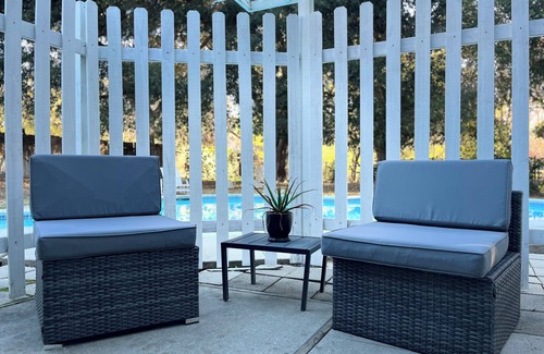 Beautiful 3 bedroom plus bonus room and two bathroom ranch-style home complete with a spacious fenced backyard, pool, and bbq. Oak trees line the seasonal creek that borders the property, providing shade and privacy. Sleeps 8. Wifi and cable provided. The rental includes 4 E-bikes to explore with.