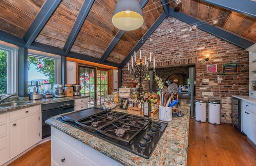 The materials used to build the home are steeped in California heritage. The brick was salvaged from a hotel that burned down in San Francisco and 80,000 pieces were transported in railcars by barge. The original slate was sourced from the Sierra Nevada mountains. The wood rafters are from old ships and the mortar for the bricks was made using local sand. The home’s original radiant floor heating system was one of the first in the area to be created and is still working.