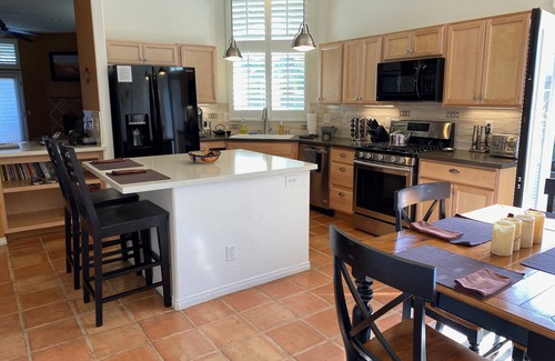 We’ve made the entire house accessible for guests except for one owners closet and one owners cabinet. There’s a smart garage door opener, keyless Schlage locking system, and we have the alarm accessible on our cell phones to make check in a breeze. We have cohosts just down the street to help with anything that may come up. In addition to complimentary high-speed wifi throughout the house, there are large TVs in every bedroom and the living room (65 inch) and master (50 inch) both have brand new 4k smart Tvs. Hulu Live (with Showtime and HBO), Netflix and Apple TV (log into your iTunes account) will give you access to the latest tv shows and movies. There are three bedrooms with high quality linens and extra snuggly Barefoot Dreams blankets & robes for those chilly desert nights. The masterCal King and queen bedroom beds are both high quality Sealy pillow top mattresses and the two twin beds are both high quality hybrid memory foam mattresses that have dreamy pillow tops beds on them for that perfect deep vacation sleep. We have an additional air bed we haven’t listed as an extra bed but it’s on the premises and available for use. There are two full bathrooms with all of the amenities, extra towels and black make-up washcloths to make laundry a breeze (a personal favorite of mine). The kitchen is fully equipped with everything you need to make your stay as convenient as possible right down to the electric salt and pepper grinders and condiments stocked in the fridge. There are pool loungers to relax in (pool towels available for your use), a large BBQ gas grill complete with outdoor patio table and chairs and a massive retractable sun umbrella to stay cool in the shade while enjoying those outdoor meals and taking in the beautiful panoramic desert mountain views and exquisite sunsets. Our favorite thing to do is watch the sun go down behind the mountains while enjoying a cold beverage in the hot tub, sit in the relaxing full-body massage chair in the master bedroom (we run a spa are huge supporters of taking good care of your body) and then snuggle into bed for some of the best sleep we’ve ever had. This is our vacation home and we’ve tastefully decorated with things we love including a few prints from our favorite artist Michael Parkes. Some of his works artistically depict semi nude (topless) women. We absolutely love them and have small children ourselves but want to be sure if you’re traveling with children you’ve looked at the pictures in the listing carefully and feel the same way.