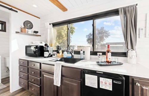 There are two tiny homes on the property which can be rented together or separately. The fire pit and bbq grills are shared, but all other amenities are separate. The tiny homes are located in a pasture on an acre ranch west of the town of Tulare. The pasture is home to sheep, cows, horses, a pig, and our trusty dog Charlie. There is a main residence on the front of the parcel and the tiny homes are located in the back. Surrounding the tiny homes are miles of fields and orchards, you’re welcome to walk/jog down the dirt lanes.
