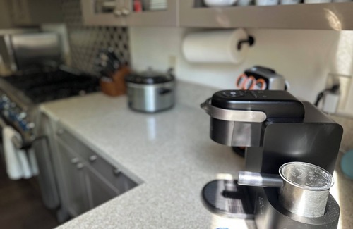 Whip up meals in the chef’s kitchen, equipped with Thermador appliances, a large island with bar seating, and a dining table for up to eight. It’s fully stocked for lattes, dinners, or baking treats.